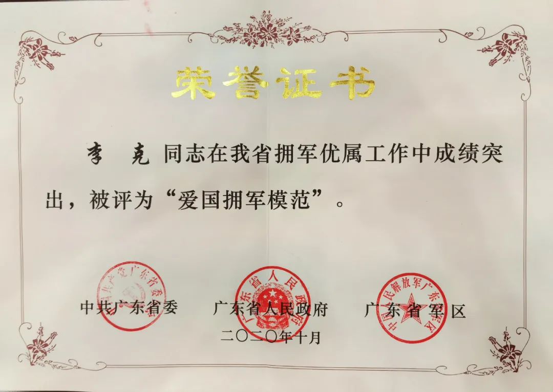 關愛戰(zhàn)友,熱心公益 退役近40年,李克先后共5次組織帶領烈士親屬和戰(zhàn)友們遠赴廣西靖西、那坡烈士陵園緬懷犧牲的戰(zhàn)友,多次帶領戰(zhàn)友們和烈士親屬遠赴廣西軍區(qū)、法卡山英雄連、塔山英雄團、西沙永興島部隊、云南邊防部隊、雄獅海軍陸戰(zhàn)部隊等多支部隊慰問現(xiàn)役部隊和軍人。只要戰(zhàn)友有困難,他總是第一時間伸出援手,幫助解決困難。多年來,他本人累計捐款超過30多萬元,并發(fā)動號召各界捐款超過50多萬元幫扶退役軍人及軍烈屬。為了更好地服務退役軍人及其他優(yōu)撫對象,2018年,李克主動建立中山市東區(qū)博愛擁軍志愿服務隊,并擔任首任隊長。志愿服務隊成立以來,經常性開展走訪慰問傷殘困難退役軍人活動,配合協(xié)助鎮(zhèn)街為退役軍人懸掛“光榮之家”牌匾。傳承優(yōu)良傳統(tǒng)、弘揚社會風尚,先后為機關、學校、社區(qū)等單位團體開展黨史學習教育和“重溫紅色記憶·弘揚愛國精神”主題宣講活動80多場次,宣講群體超3萬人次。