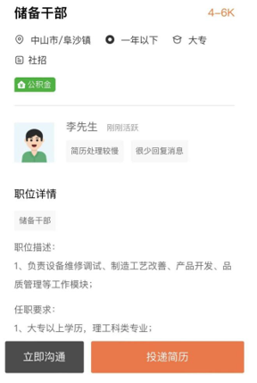 ▲求職者注冊流程 3、投遞簡歷 完善注冊信息后,即可跳轉(zhuǎn)至【2022年度珠中江區(qū)域退役軍人及隨軍家屬網(wǎng)絡(luò)招聘會】,點(diǎn)擊職位名稱可進(jìn)入相應(yīng)職位詳情頁,點(diǎn)擊企業(yè)可進(jìn)入企業(yè)詳情頁,可查看企業(yè)發(fā)布的在線職位。 點(diǎn)擊職位詳情頁左下方【立即溝通】可和HR進(jìn)行溝通,點(diǎn)擊右下方【投遞簡歷】即可完成投遞。