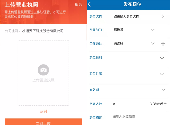 ▲企業(yè)注冊流程 2、發(fā)布職位 完善注冊信息后,即可進(jìn)入到【企業(yè)會員中心管理后臺】,發(fā)布職位前【上傳營業(yè)執(zhí)照】,【通過審核后】即可發(fā)布職位,企業(yè)發(fā)布的符合條件的崗位將同步更新至【2022年度珠中江區(qū)域退役軍人及隨軍家屬網(wǎng)絡(luò)招聘會】