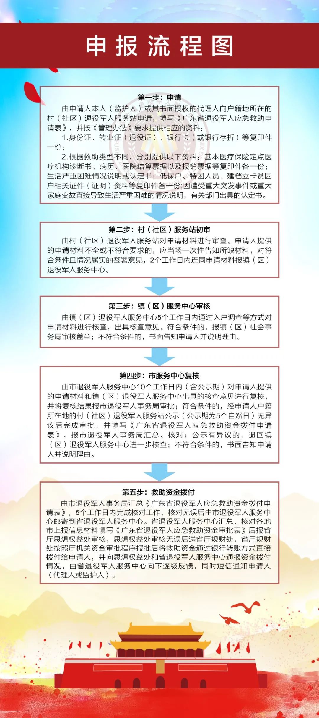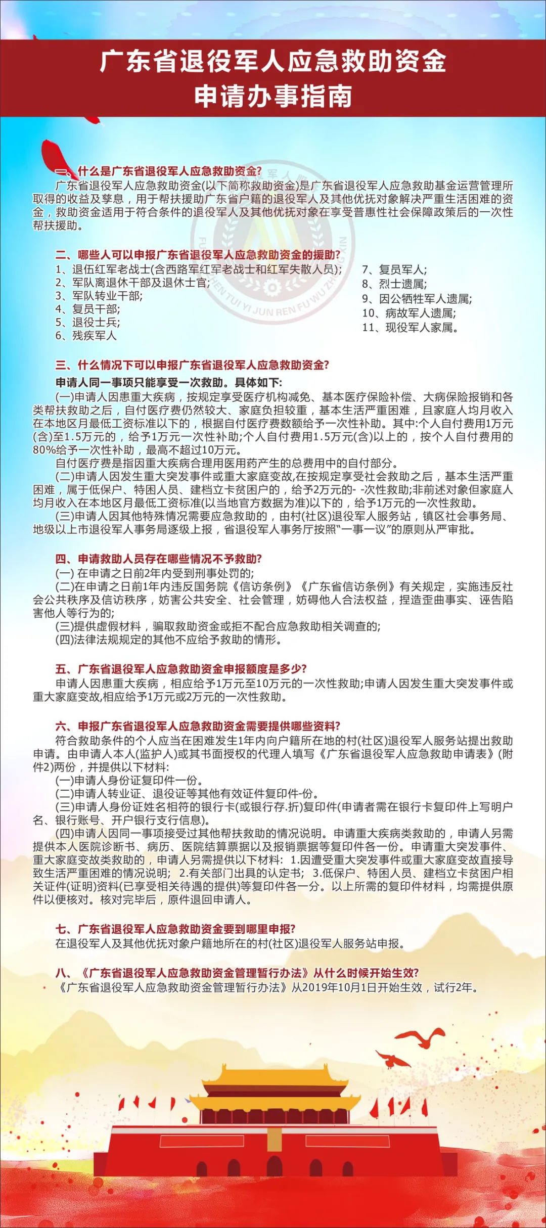 廣東省退役軍人應(yīng)急救助資金自2019年7月設(shè)立以來(lái),為我市退役軍人及其他優(yōu)撫對(duì)象提供了有力的幫扶援助。 其救助類(lèi)型主要分為四類(lèi):申請(qǐng)人因患重大疾病、發(fā)生重大突發(fā)事件、發(fā)生重大家庭變故或其他特殊情況導(dǎo)致基本生活嚴(yán)重困難的。符合條件的申請(qǐng)人可向戶籍地所在的村(社區(qū))退役軍人服務(wù)站進(jìn)行申請(qǐng)。 |