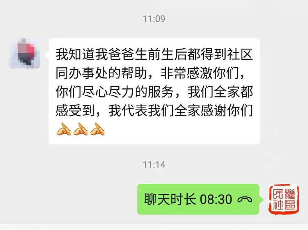 “我父親生前生后都得到社區(qū)和辦事處的幫助,非常感謝你們!你們盡心盡力的服務(wù),我們?nèi)叶几惺艿?!?/p>