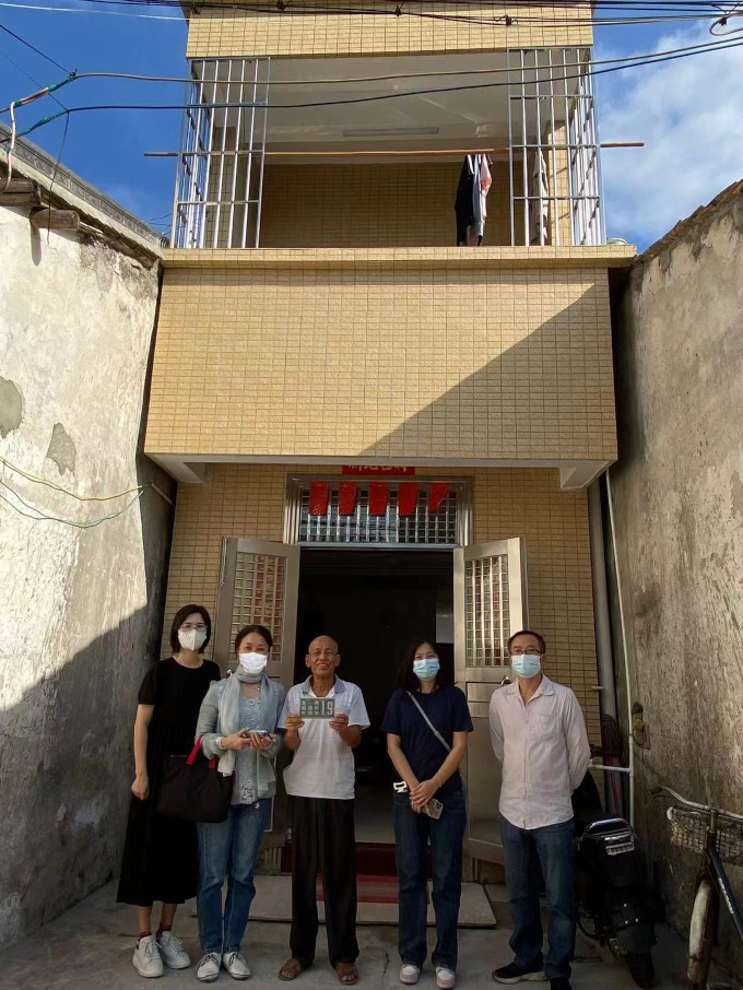沙溪鎮(zhèn)退役軍人劉叔在新房前開(kāi)心地展示門牌號(hào)。 市退役軍人事務(wù)局供圖)