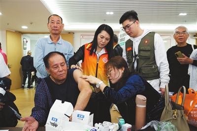 工作人員、志愿者協(xié)助退役軍人測血糖。本報記者 黃藝杰 攝
