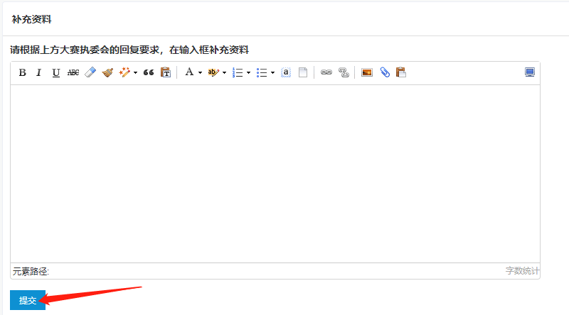 圖14 08 補(bǔ)充資料提交 若想對(duì)已提交的報(bào)名信息進(jìn)行補(bǔ)充,可在登陸首頁(yè)點(diǎn)擊“我的報(bào)名記錄”,點(diǎn)擊【查看詳情】進(jìn)入報(bào)名表詳情頁(yè)面,拉至頁(yè)面底部的補(bǔ)充資料欄,點(diǎn)擊回形針圖標(biāo)添加補(bǔ)充文件,再點(diǎn)擊提交即可。如圖15-16所示: