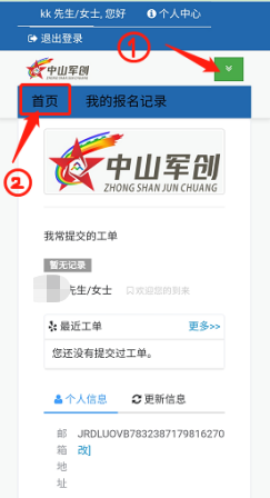 圖23 登錄成功后可跳轉(zhuǎn)至“個(gè)人中心”,點(diǎn)擊右上角綠色圖標(biāo)可展開(kāi)菜單欄,點(diǎn)擊【首頁(yè)】即可進(jìn)入“參賽承諾書(shū)”確認(rèn)界面開(kāi)始填寫(xiě)報(bào)名列表。如圖24所示: 報(bào)名列表填寫(xiě)詳細(xì)操作可參考報(bào)名方式一“官方網(wǎng)站報(bào)名”步驟4-8指引。