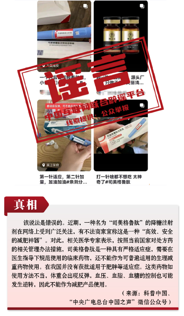 有關(guān)呼吸道疾病防治的謠言和誤區(qū)誤導(dǎo)公眾。隨著各地陸續(xù)入冬,呼吸道疾病進(jìn)入高發(fā)季節(jié),多種呼吸道疾病交織疊加,難免讓人焦慮。恰在此時(shí),網(wǎng)上一些治病養(yǎng)生醫(yī)藥“偏方”頻出,一些自媒體假借專業(yè)人士和醫(yī)生網(wǎng)上“開(kāi)方”,真假難辨、誤導(dǎo)公眾。如“感染肺炎支原體會(huì)得肺炎、會(huì)出現(xiàn)‘白肺’”“可自行給孩子服用阿奇霉素等藥物以預(yù)防支原體肺炎”“可網(wǎng)上購(gòu)買‘醫(yī)院同款’霧化器在家自療”等謠言,抓住人們對(duì)疾病的恐懼心理大肆傳播,有的耽誤正常治療,有的則是“假科普、真帶貨”。此外,“使用司美格魯肽能輕松減肥”的謠言,無(wú)視權(quán)威部門(mén)對(duì)處方藥的相關(guān)管理辦法措施,此類藥品若盲目使用或者使用不當(dāng),存在很大健康風(fēng)險(xiǎn)。