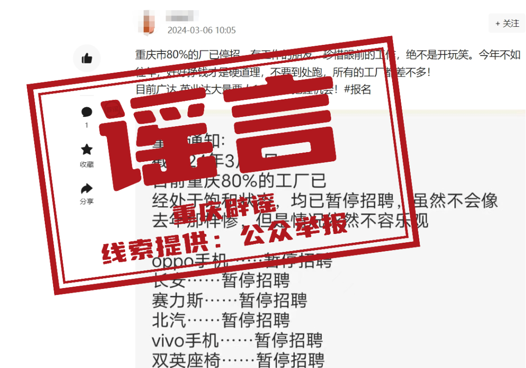 近日,有網(wǎng)民在某網(wǎng)絡(luò)平臺(tái)上發(fā)布信息:“目前重慶市80%的廠已處于飽和狀態(tài),均已暫停招聘”,引發(fā)社會(huì)關(guān)注。經(jīng)相關(guān)部門核實(shí),網(wǎng)傳信息為謠言。