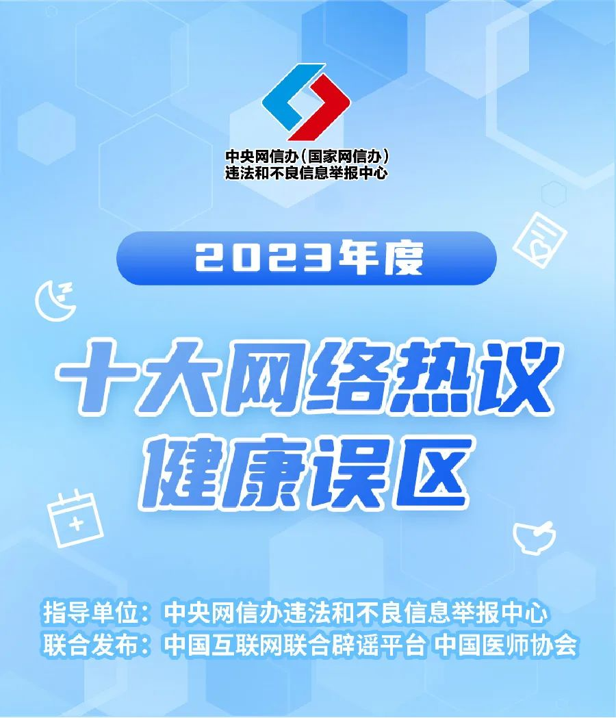 為守護(hù)人民群眾生命健康,中國互聯(lián)網(wǎng)聯(lián)合辟謠平臺、中國醫(yī)師協(xié)會聯(lián)合發(fā)布《2023年度十大網(wǎng)絡(luò)熱議健康誤區(qū)》,澄清醫(yī)療健康、飲食營養(yǎng)、科學(xué)運動等方面的誤區(qū),幫助網(wǎng)民提升識謠辨謠能力。
