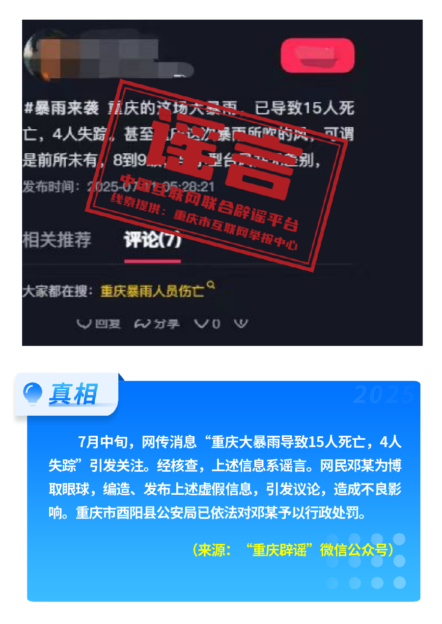近期,網(wǎng)上接連出現(xiàn)發(fā)布虛假“警情通報(bào)”的惡性造謠傳謠案件,炮制傳播“昆明駕車(chē)撞人案131人死亡”“杭州自來(lái)水接入糞水”及涉釋永信虛假“警情通報(bào)”,模仿“藍(lán)底白字”格式,杜撰聳人聽(tīng)聞細(xì)節(jié),損害政府公信力,嚴(yán)重?cái)_亂社會(huì)秩序?!霸菏款A(yù)測(cè)廣東將發(fā)生8級(jí)以上大地震”公然偽造專家聊天截圖,謊報(bào)地震預(yù)警。還有造謠者借盛夏高溫酷暑與洪澇災(zāi)害,編造“安徽淮北、山東泰安等地多人因高溫死亡” “重慶大暴雨導(dǎo)致15人死亡、4人失蹤”等謠言,蹭炒熱點(diǎn)、煽動(dòng)情緒。