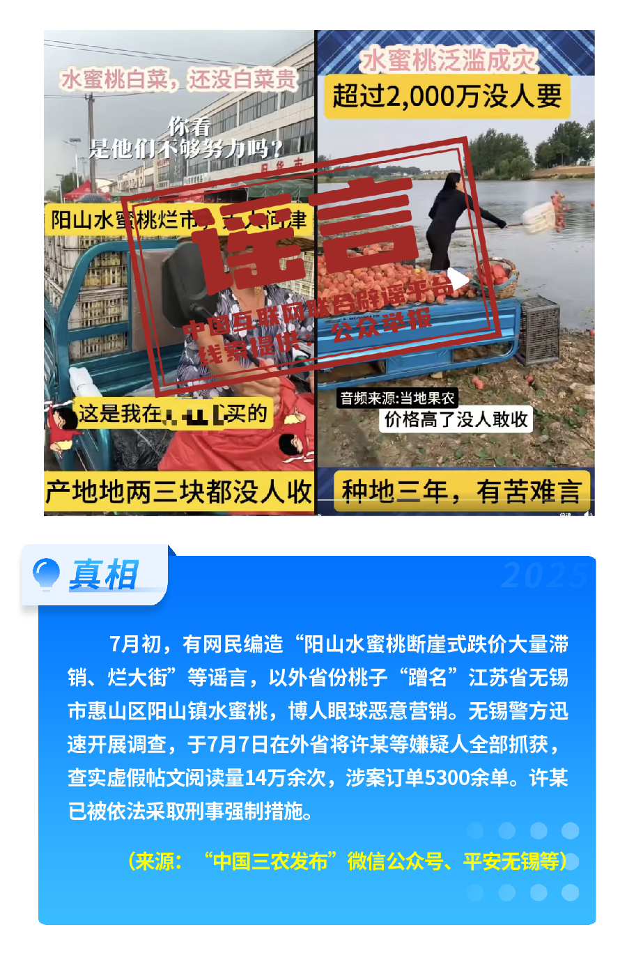 此外,7月份正值暑期旅游旺季和水果等農(nóng)產(chǎn)品收獲季,有自媒體、商家借機(jī)編造傳播涉文旅及農(nóng)產(chǎn)類謠言,干擾市場(chǎng)秩序,侵害消費(fèi)者權(quán)益。有商家違規(guī)使用人民大會(huì)堂建筑圖片標(biāo)識(shí)和名稱,仿冒人民大會(huì)堂賬號(hào),非法售賣(mài)、倒賣(mài)參觀門(mén)票,損害游客權(quán)益。個(gè)別商家剪輯發(fā)布“江蘇無(wú)錫陽(yáng)山水蜜桃斷崖式跌價(jià)、大量滯銷、爛大街”謠言視頻,再借機(jī)兜售假冒的陽(yáng)山水蜜桃,博人眼球惡意營(yíng)銷,擾亂市場(chǎng)秩序。所謂“峨眉山人猴大戰(zhàn),游客墜崖,猴王被當(dāng)場(chǎng)擊斃”景區(qū)安全事件一度傳得沸沸揚(yáng)揚(yáng),相關(guān)視頻以驚悚情節(jié)博取關(guān)注,畫(huà)面實(shí)際是用AI合成拼接制作。