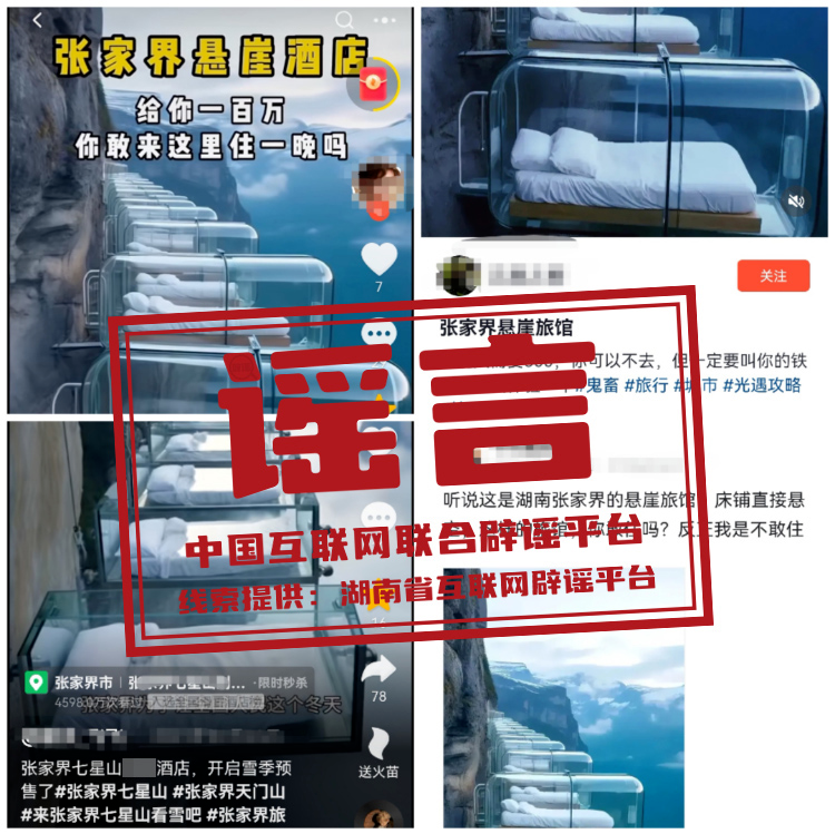 真相:近日,某短視頻平臺出現(xiàn)多條所謂“張家界懸崖酒店”的視頻,視頻顯示“幾張由玻璃罩著的床,整齊地排列在懸崖上”,文案稱“張家界懸崖旅館房費一個晚上500元”。對此,經(jīng)媒體記者采訪核查,張家界文旅局及張家界國家森林公園景區(qū)工作人員均表示“不知道懸崖旅館”。同時,記者問詢張家界多家酒店、客棧,均未找到視頻中的“懸崖酒店”。(來源:上游新聞)