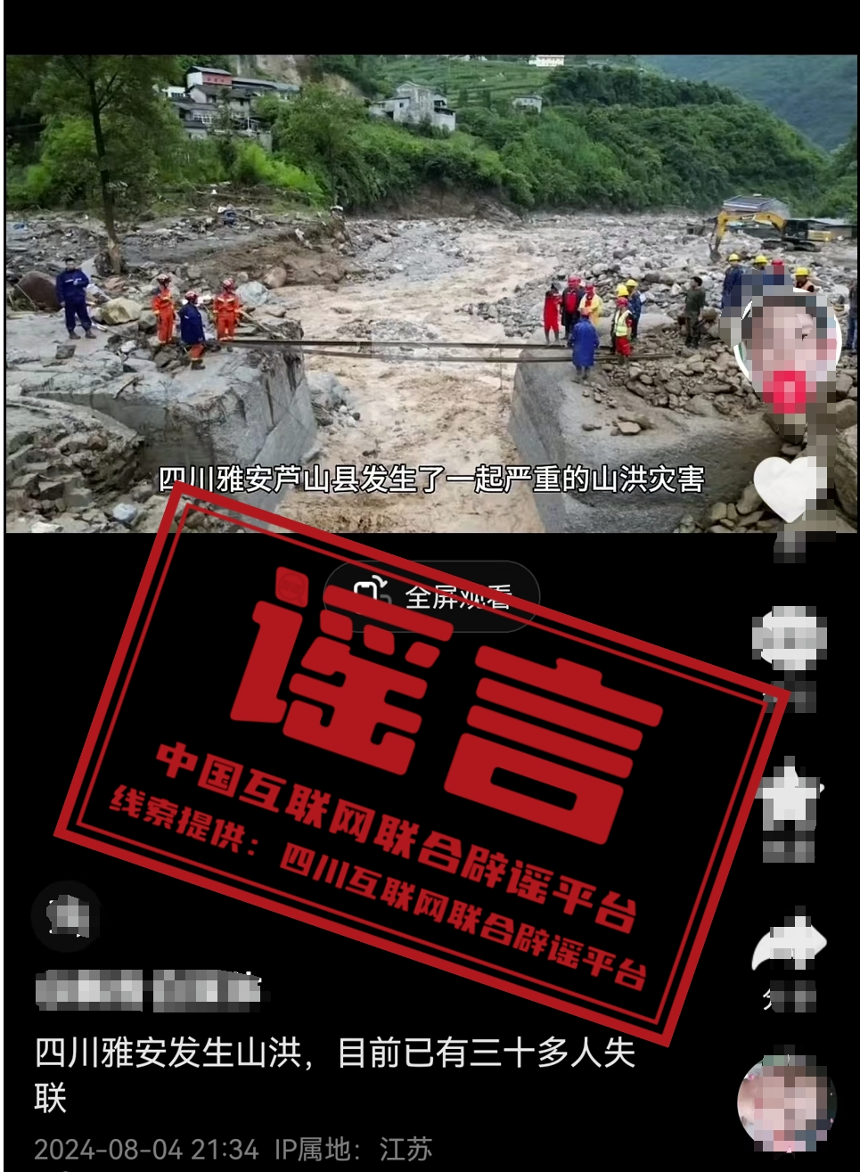 謠 言 四川雅安蘆山縣發(fā)生山洪災害致三十多人失聯(lián)?