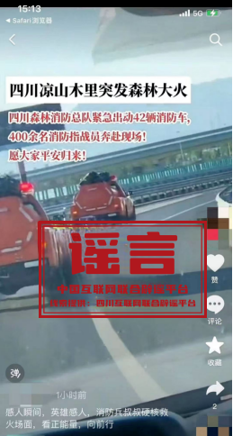 真相:近日,有網(wǎng)民在短視頻平臺(tái)上發(fā)布視頻,并配以“四川涼山木里突發(fā)森林大火,四川森林消防總隊(duì)緊急出動(dòng)42輛消防車,400余名消防指戰(zhàn)員奔赴現(xiàn)場(chǎng)”的文字。當(dāng)?shù)鼐W(wǎng)信部門(mén)聯(lián)動(dòng)應(yīng)急管理局進(jìn)行查核,證實(shí)四川涼山木里近日未發(fā)生森林大火。(來(lái)源:四川互聯(lián)網(wǎng)舉報(bào)辟謠平臺(tái))