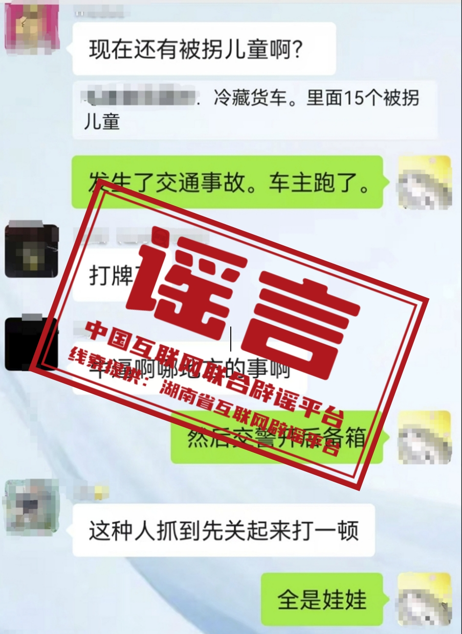 真相:9月4日,一則“湖南一冷藏車(chē)發(fā)生交通事故,交警在車(chē)上發(fā)現(xiàn)15名被拐兒童”的消息在網(wǎng)絡(luò)社交平臺(tái)傳播,引發(fā)網(wǎng)民關(guān)注。5日,湖南省湘潭市公安局雨湖分局發(fā)布警情通報(bào),“經(jīng)公安機(jī)關(guān)查證,該信息系謠言”。目前,虛構(gòu)事實(shí)擾亂公共秩序的違法行為人朱某已被公安機(jī)關(guān)依法行政拘留。(來(lái)源:“湖南省互聯(lián)網(wǎng)舉報(bào)中心”微信公眾號(hào)、“雨湖公安”微信公眾號(hào))