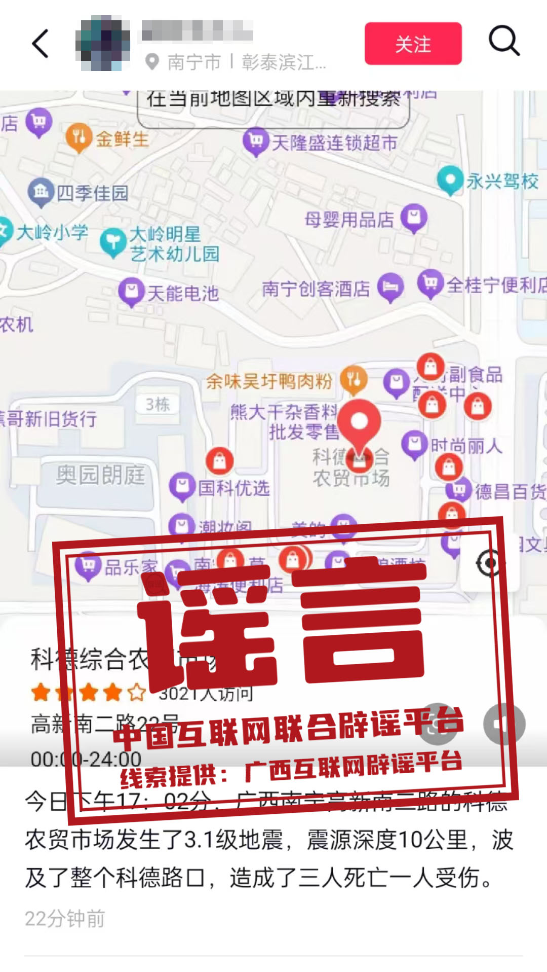 真相:2月12日,有網(wǎng)民在某短視頻平臺(tái)發(fā)文稱“今日下午17:02分,廣西南寧高新南二路的科德農(nóng)貿(mào)市場(chǎng)發(fā)生了3.1級(jí)地震。”經(jīng)向有關(guān)部門核實(shí),此信息為謠言。據(jù)廣西地震臺(tái)網(wǎng)和南寧市地震監(jiān)測(cè)中心數(shù)據(jù)顯示,南寧市及其鄰區(qū)無有感地震發(fā)生,亦無震情和災(zāi)情信息反饋。目前,謠言線索已轉(zhuǎn)交相關(guān)部門對(duì)造謠者進(jìn)行進(jìn)一步調(diào)查處置。(來源:“廣西互聯(lián)網(wǎng)違法和不良信息舉報(bào)”微信公眾號(hào)、南寧市互聯(lián)網(wǎng)舉報(bào)·辟謠平臺(tái))
